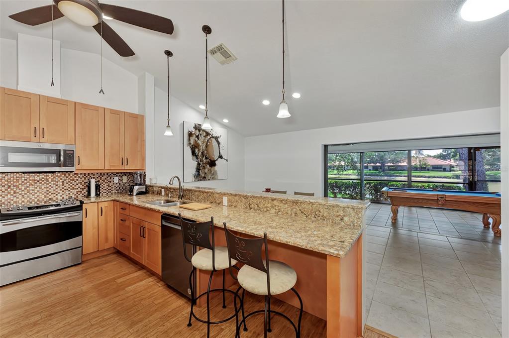 Beautiful 2 bedroom 2 bathroom + a den villa with gorgeous lake views. The front entry is gated for your privacy. When you walk through the front door the large windows, vaulted ceilings and open floor plan give this home a light, bright and breezy feel. The kitchen is a cookβs dream with the updated stainless steel appliances, quartz countertops, tons of cabinets space and looks over the dining space, huge Florida room and beautiful lake views! The large master suite features plenty of room for a king size bed and connects to a big bonus room that would be perfect for an office or playroom. The updated master bathroom comes with a double vanity sink with granite countertops and a walk- in shower. This home features tons of storage with multiple closets and a large two car garage. All of this is located in the highly sought after Palm Aire community and is an end unit next to a conservation land with amazing privacy. The Palm Aire community is adjacent to the University Parkway corridor boasting fabulous restaurants and shopping, only 20 minutes to classy downtown Sarasota and our gorgeous beaches, just 10 minutes to bustling Lakewood Ranch and close to I-75. The furniture in the home can stay or go.